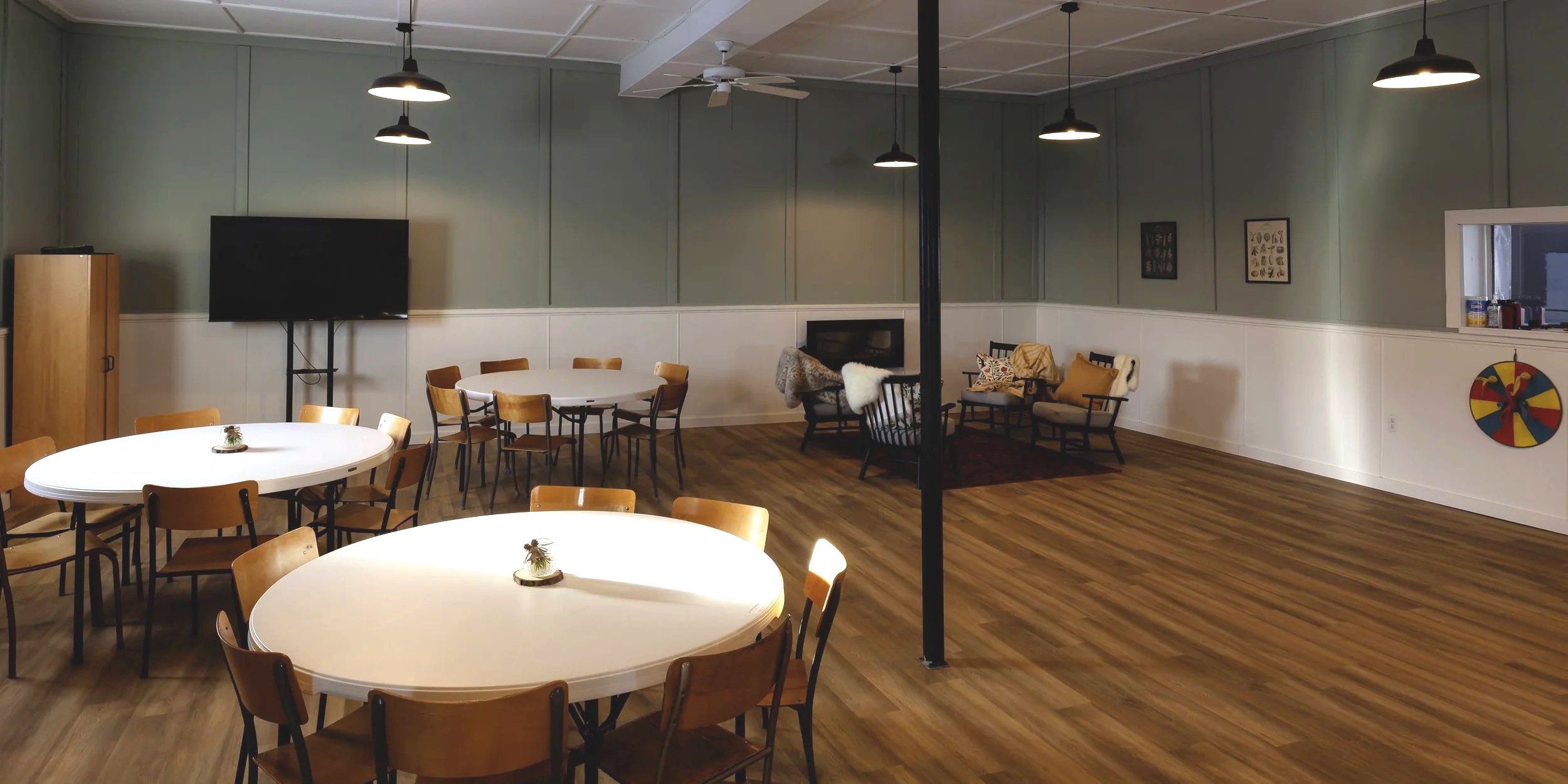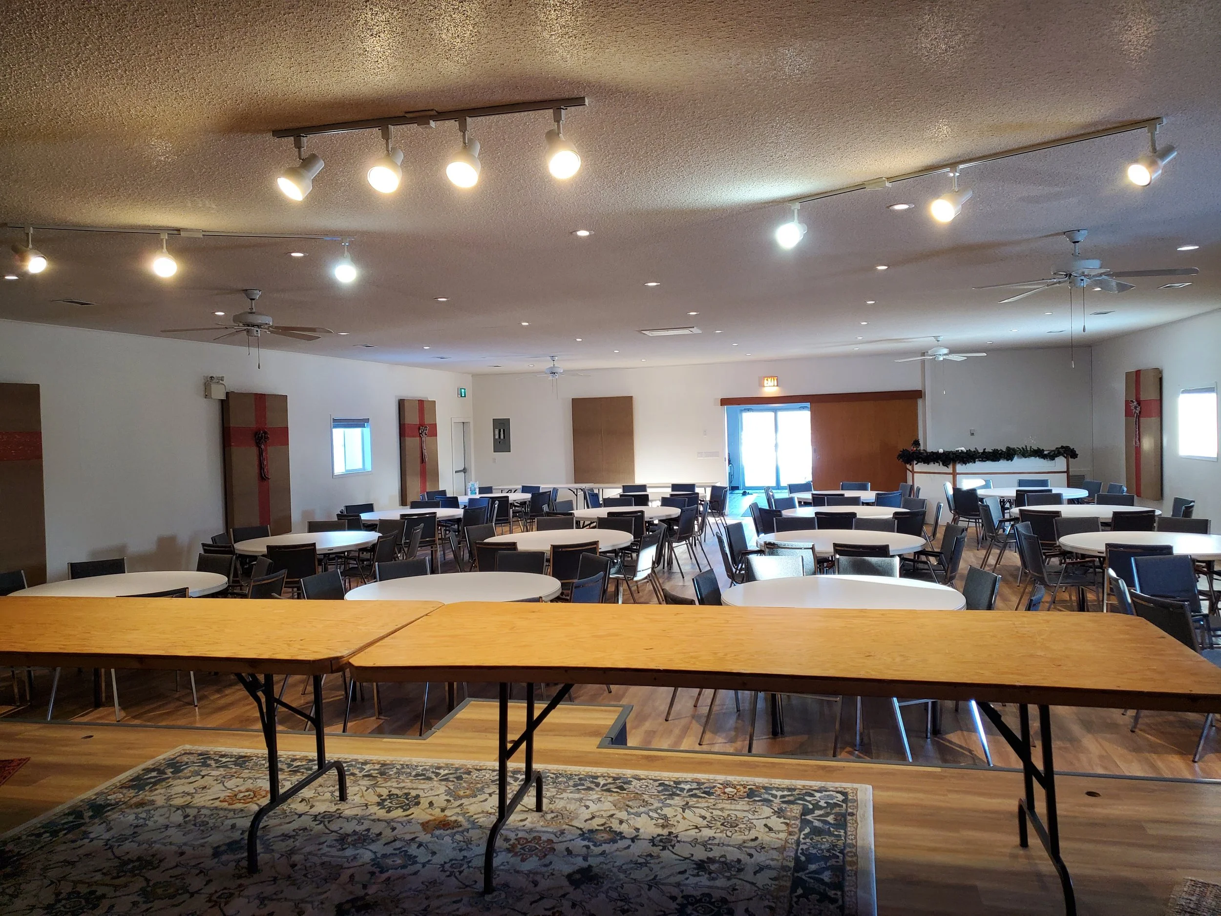 A perfect place to enjoy a meal. We can accommodate up to 9 tables with 8 people/table. It has a full food prep area including deep freezers, fridges, sinks, dishes, cutlery, coffee machines, etc. It also has audio and visual capabilities. Or, we can change things up and transform it into an indoor games space or a coffee house with live music.